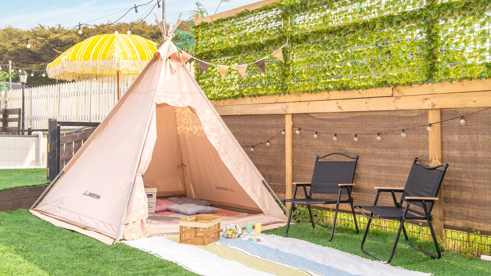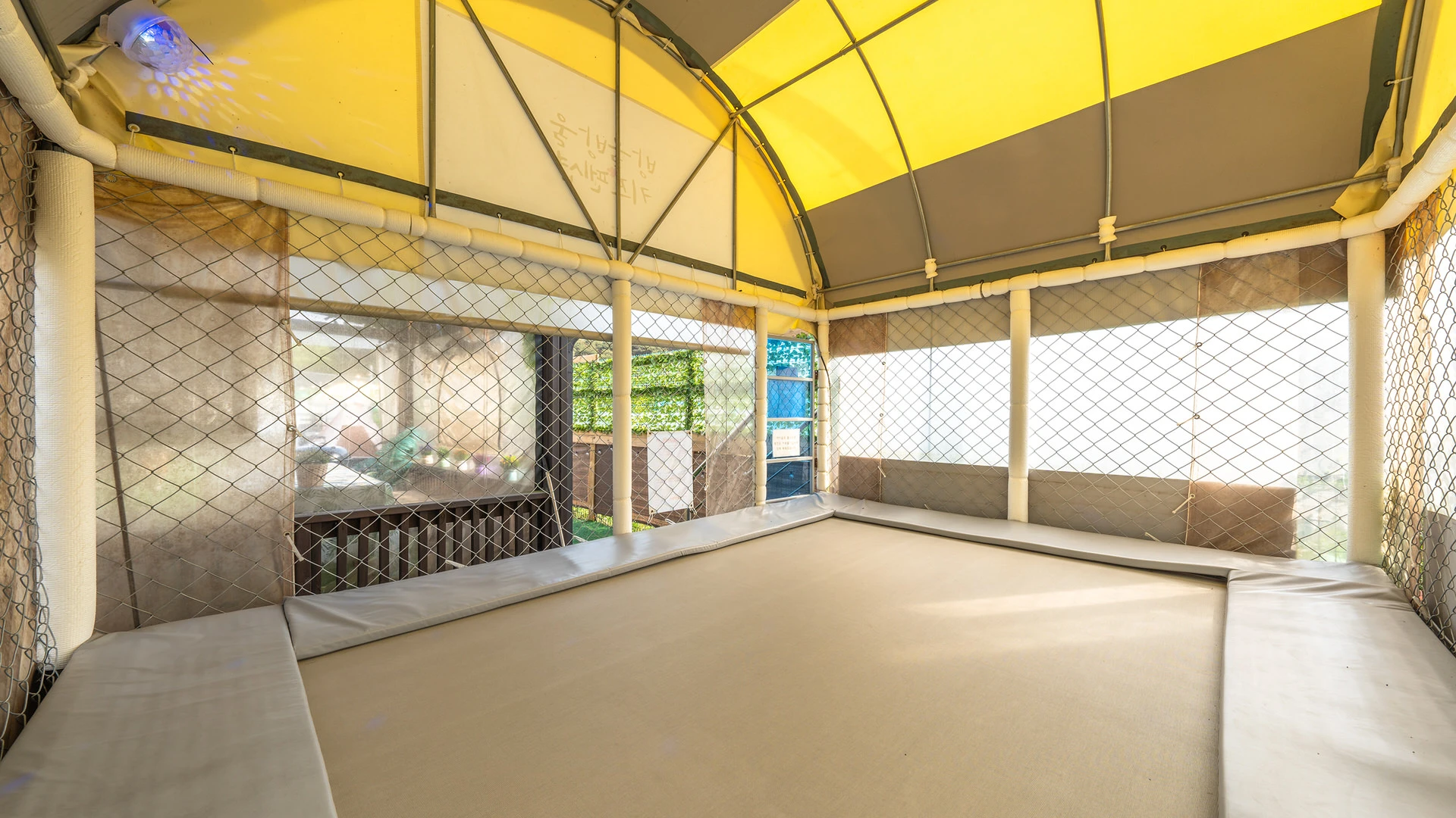 야외 감성텐트과 대형 트램폴린이 있는 야외 키즈놀이터가 준비되어 있습니다. 아이들과 즐거운 시간을 보내보세요.